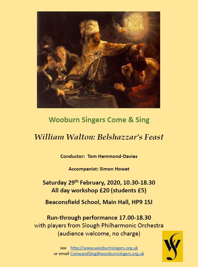 Come & Sing – Walton: Belshazzar’s Feast Event Details Date: 29 February, 2020 10:30 – 18:00 Venue: The Beaconsfield School Categories: Come and Sing Day email: ComeandSing@wooburnsingers.org.uk Download the booking form here