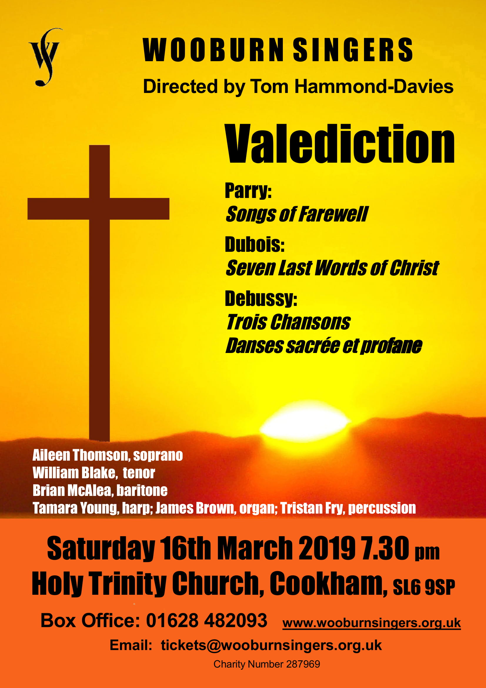 Music for Passiontide Event Details Date: 16 March, 2019 19:30 – 22:00 Venue: Holy Trinity Church, Cookham Categories: Concert Parry: Songs of Farewell Debussy: Danses sacrée et profane Debussy: Trois Chansons Dubois: Les Sept Paroles du Christ (The 7 Last Words from the Cross) Tickets: £15 (Under 18 free) 01628 482 093 or tickets@wooburnsingers.org.uk