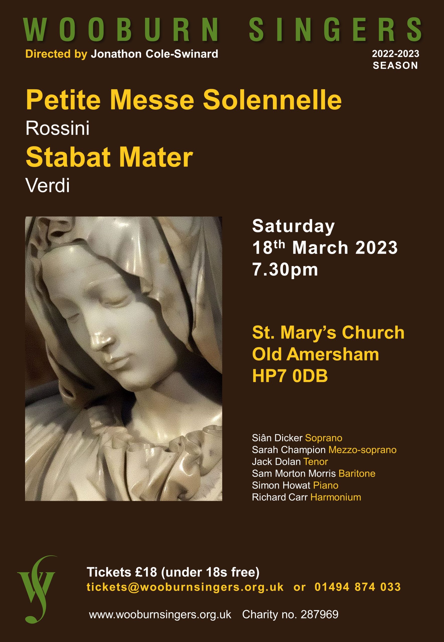 Spring Concert 2023 – Rossini: Petite Messe Solennelle, Verdi: Stabat Mater Event Details Date: 18 March, 2023 19:30 – 21:30 Venue: St Mary’s Church, Old Amersham Categories: Concert St Mary’s Church, Old Amersham HP7 0DB 18 March 2023 7 :30pm Tickets: £18 (under 18s free) can be purchased by: – emailing tickets@wooburnsingers.org.uk – calling 01494 874033 – or via The Little Box Office