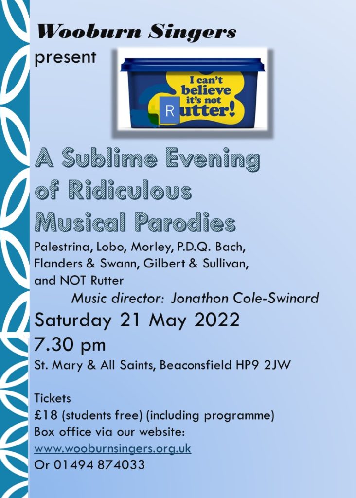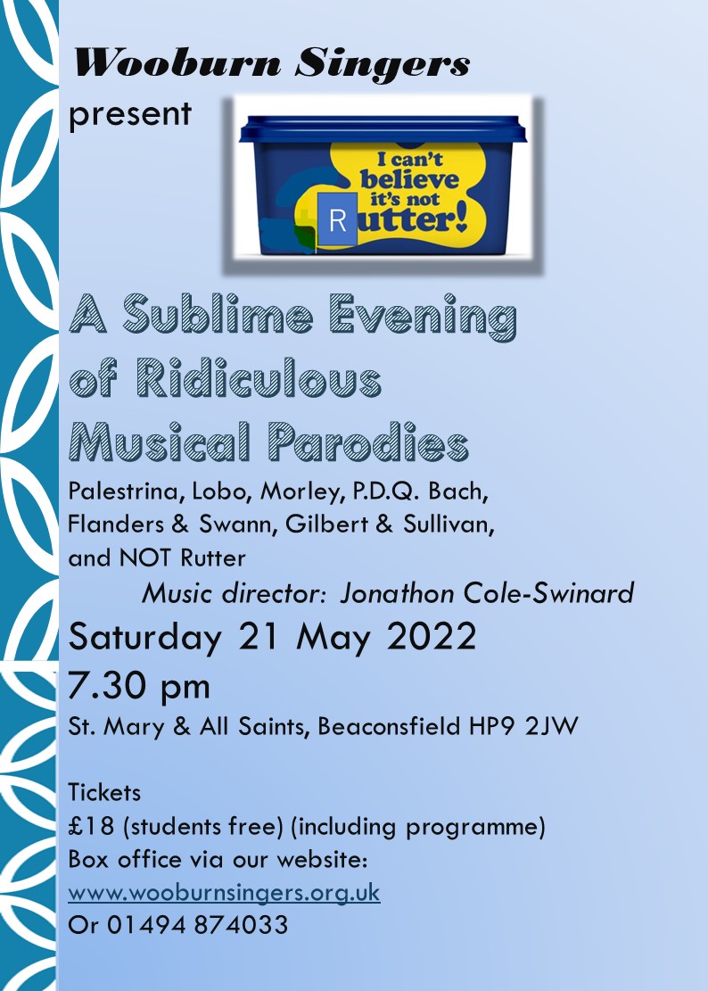 A sublime evening or ridiculous musical parodies, featuring music by Palestrina, Lobo, Morley, PDQ Bach, Flanders & Swann, Gilbert & Sullivan and NOT Rutter